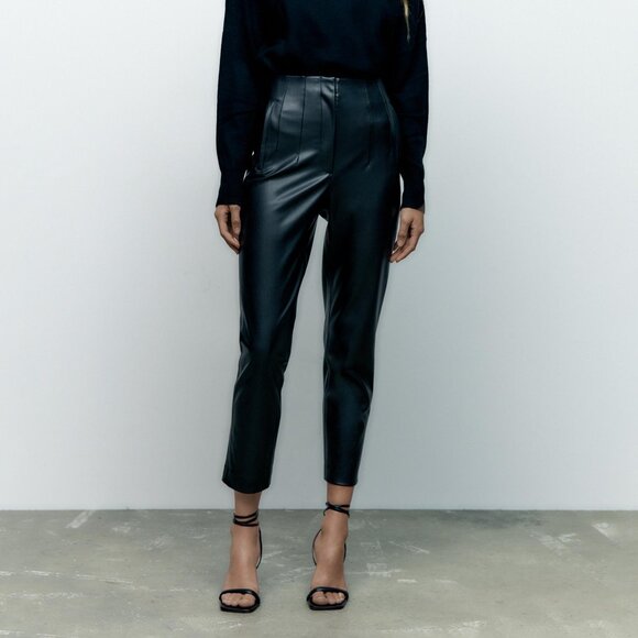 ZARA Faux Leather Straight Leg Pants Size XL – Black High Waist Vegan Leather Trousers