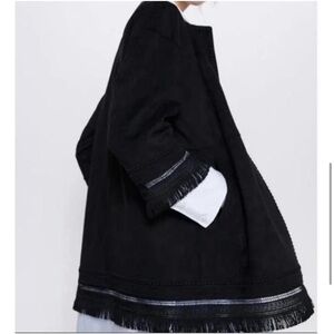 ZARA Faux Suede Fringed Trim Boho Jacket in Black Medium Women’s Festival