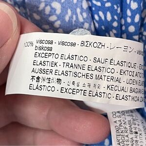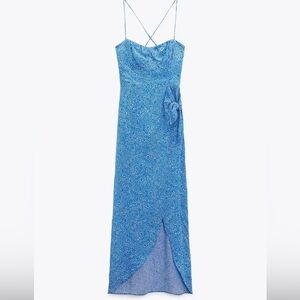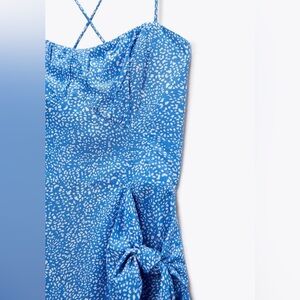 Light blue and white lightweight corset style faux wrap dress with spaghetti shoulder straps that crisscross over the open back. Smocked lower back, side zip closure, knotted detail at left hip.