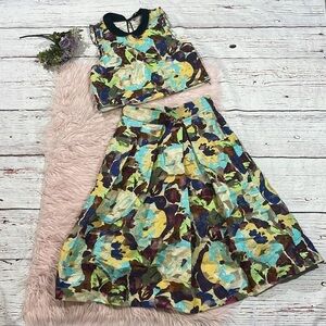 Zara multi colored floral embroidered mesh Peter Pan collared crop top and pleated midi skirt set. This set is in great used condition