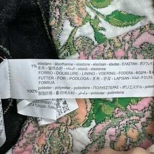 Gorgeous and eye-catching mini dress from Zara featuring a bold floral jacquard fabric in shades of green, pink, and cream. The dress includes rhinestone detailing along the neckline for added sparkle, with dual spaghetti straps—one in matching floral and the other in contrasting pink.