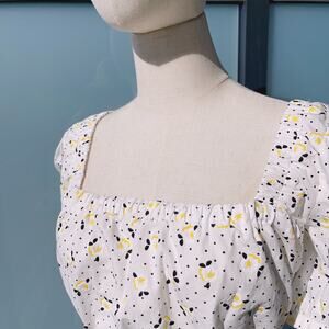 Short top with a squared neckline and short balloon sleeves. Elastic hem. Cross-back ties closure. Contrasting raised floral print detail.