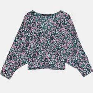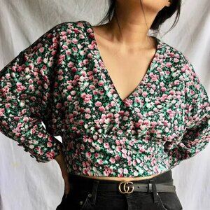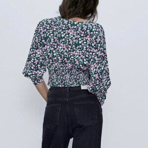 ZARA Floral V-neck Cropped Smocked Puff Sleeve Blouse Top Green Pink Size S