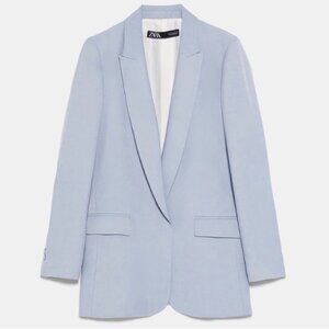 Calling all blondes!! Zara beautiful french blue blazer features a no-button open front, long sleeves with two fabric covered buttons, a lapel collar with front flap pockets. It's the gorgeous color that really makes this blazer stand out. Excellent pre-owned condition. SZ medium.