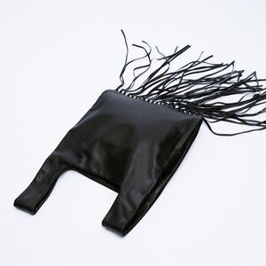 Leather handbag with bottom fringe detail. Lined interior with pocket. 10.4 H x 10.6 L inches