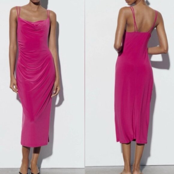 ZARA Fuchsia Draped Midi Dress Size S