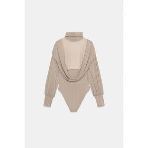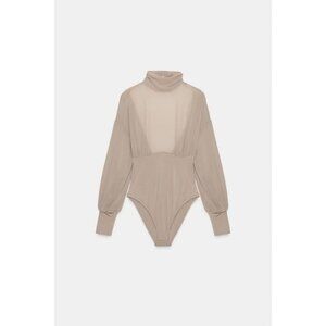 Bodysuit with adjustable high collar with buttons and voluminous long sleeves with elasticized cuffs. Back with fluid neckline. Bottom snap button closure.