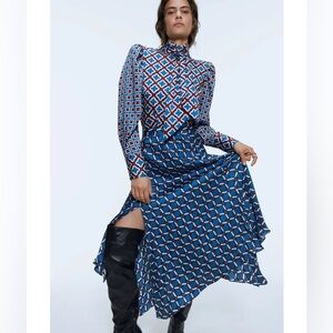 ZARA Geo Print Pleated Midi Skirt in Blue Size M