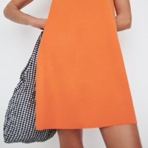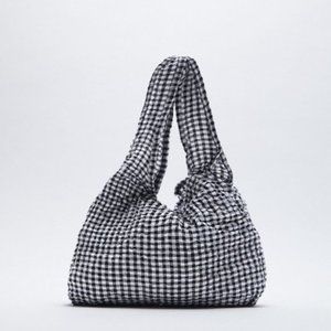 GINGHAM PRINT EXTERIOR. SHOULDER STRAPS. MAGNETIC CLOSURE.