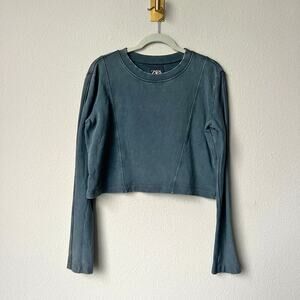 ZARA gray garment-dyed cropped terry sweater. Casual cropped silhouette with a crew neckline and lone sleeves. Front slanted seams down front. Size medium - 17" pit to pit; 12" length from pit.