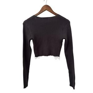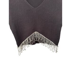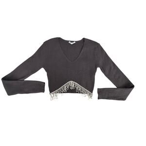 Elevate your look with this chic Zara cropped sweater featuring a deep V-neckline and elegant rhinestone & pearl loop fringe detailing at the hem. Crafted from a soft ribbed knit fabric in a dark charcoal gray, this long sleeve top adds a touch of glamour to casual or night-out outfits.