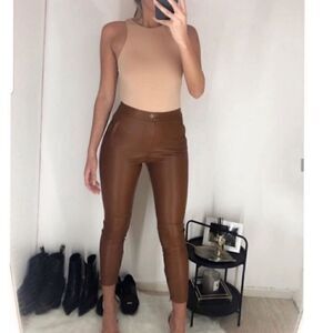 Otherwise these are a gorgeous pair of high waisted vegan brown leather pants from Zara, in a size small (not much stretch in the material, may be closer to an XS, please see measurements below). I also think my eye catches a gray-brown instead of the deep brown seen in stock photo.