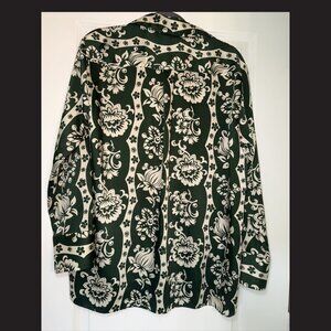 ZARA silky button-down blouse in a deep green and cream floral print, size M.