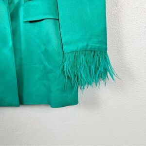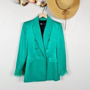 ZARA Green Satin Double-Breasted Feather Cuff Blazer Size X-Small