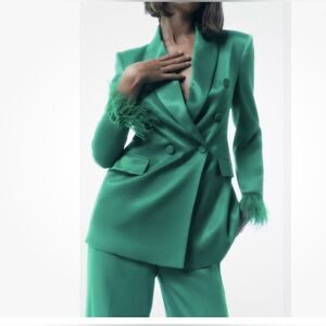 ZARA Green Satin Double Breasted Blazer Feather Cuff