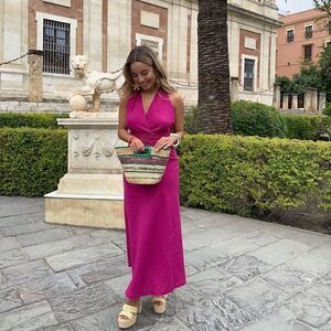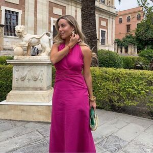 ZARA HALTER LINEN BLEND NECK MIDI DRESS MAGENTA