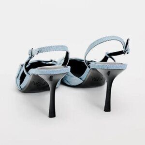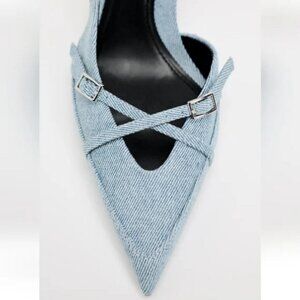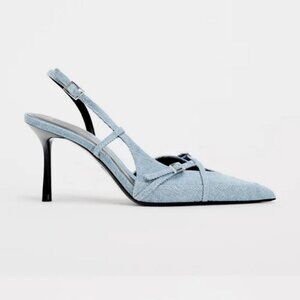 Heeled denim Slingbacks. Front straps with buckle. Thin heel. Pointed toe. Back buckled strap closure.