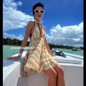 Multicolored dress made of linen blend fabric. Wrap halter top with tie. Back hidden in-seam zip closure. From ZARA, in size L. New with tags.