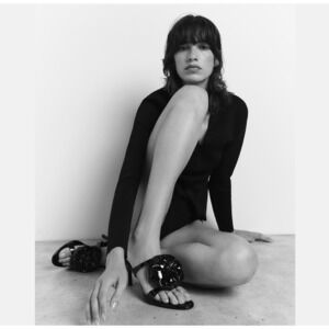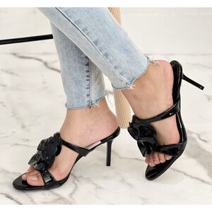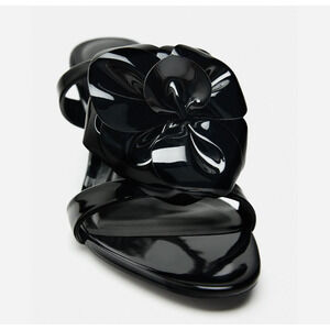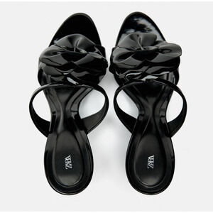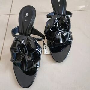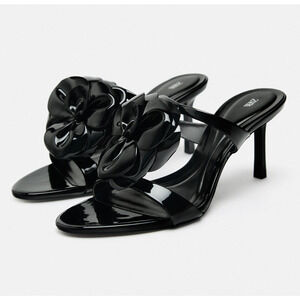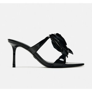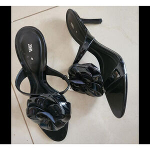 Black heeled sandals with faux patent leather. Thin straps with front floral detail. Round toe. From ZARA, in US size 7.5 (EU 38). New with tags. Sold out in stores.