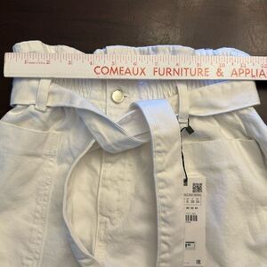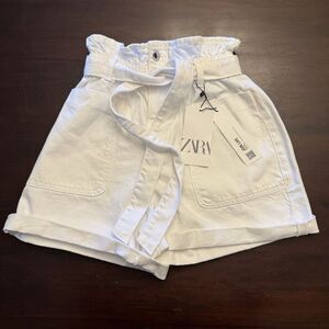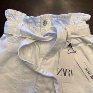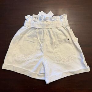 ZARA Hi Rise Rigid Paperbag Shorts White Denim Belt Size 2 Cotton Pockets Cuff