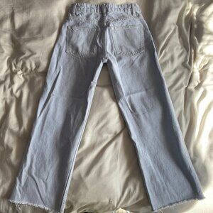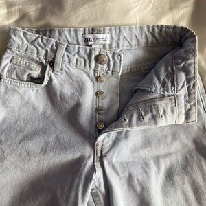 Lightly worn ZARA High-Waisted Grunge Jeans in a classic light wash denim. A flattering, structured high-rise fit with a relaxed straight leg and full button-fly closure for a vintage-inspired look. Finished with lightly frayed hems for a modern, lived-in edge. Excellent condition — no stains, rips, or flaws.