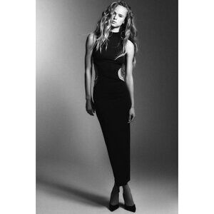 Long flowy dress with a roll neck and sleeveless design. Features a side cut-out detail and a ribbon with a jewel appliqué. Straight hem.