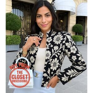 Black and white jacquard blazer in floral design. Round neck. Long sleeves. Flap pockets at front. Front snap button closure. From ZARA, in size M. New with tags. Sold out in stores.