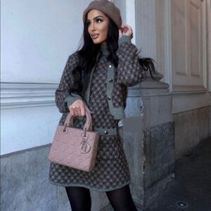 Round neck long sleeve jacket. Front gold button closure.