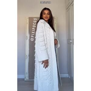 Beautiful chunky knit coat with shawl collar. Open style. Longline. Cable knit detail. Ribbed trim. Wide sleeves.