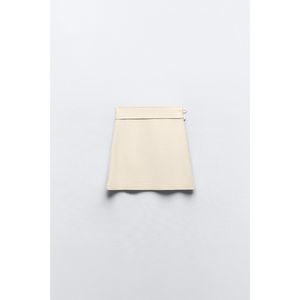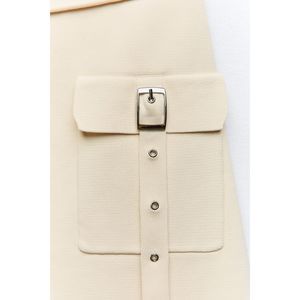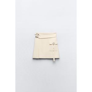 High-waisted skirt with buckles. Wrap front and flap patch pocket with buckle. A-line silhouette.