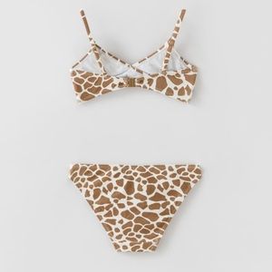 Two piece bikini. V-neck top with adjustable straps, back closure and elastic waistband bottoms.