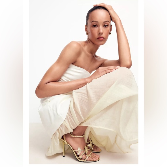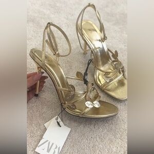 Gold Metallic effect sandals. Appliqué detail at the front. Thin high heel. Thin front straps. Buckle strap closure. Round toe finish.