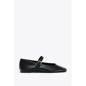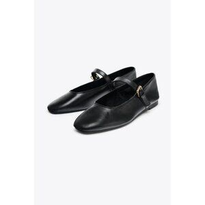 Leather ballet flats. Strap with adjustable metal buckle on the front. Contrast topstitching. Square vamp. Round toe.
