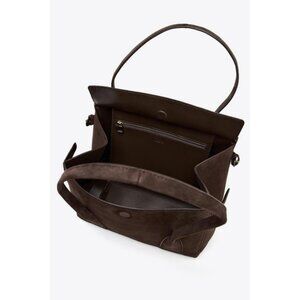 City bag style bag in leather. Shoulder strap. Strap with adjustable metal buckles on the sides. Interior zip pocket. Closes with a flap and magnetic fastening.