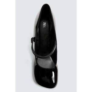 Leather heeled shoes. Patent effect. Front strap with decorative button detail. High asymmetric heel. Square pointed toe.