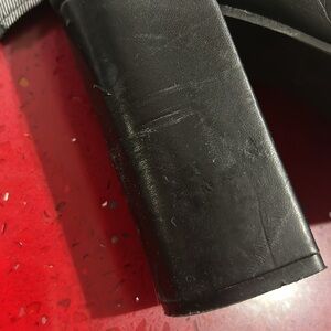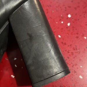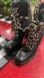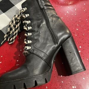 Black leather heeled ankle boots. Metal eyelets for laces. Padded collar at ankle. Wide high heel and platform lug soles. Inner side zip closure. Heel style: block/chunky Toe style: closed toe Heel height: 4.3 inches (11 cm) Leather upper/leather and synthetic lining/synthetic sole