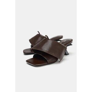 Leather sandals. Wide front strap with detail. Asymmetric kitten heel. Mule style. Square toe.