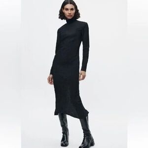 ZARA Limited Edition black midi dress featuring a unique creased/wrinkled textured fabric that gives it a sculptural, high-fashion look. The dress has a sleek silhouette with a mock turtleneck, long sleeves and a softly flared hem, elegant, minimal, and incredibly flattering.