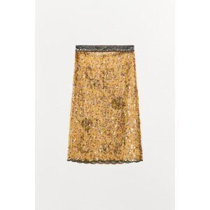 High-waist midi skirt. Featuring floral embroidery with different bead and sequin embellishments. Wavy hem. Contrasting lining. Concealed side zip fastening.