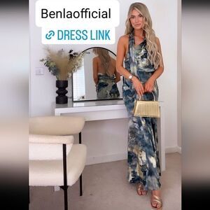 Long dress with asymmetric neckline. Knotted strap and long scarf-style self tie with button. Back elastic detail. Asymmetric hem.