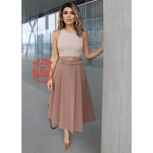 LIMITED EDITION! Beige pink high waist midi skirt with belt loops at waist. Pleat detail. Puff hem. Hidden in-seam zip closure. From ZARA, in size L. New with tags. Sold out in stores.