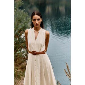Dress made in a linen blend. Round neck with a V-neck and sleeveless design. Featuring front darts and a belt. In-seam side pockets. Front button fastening.