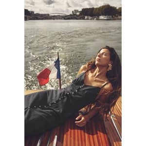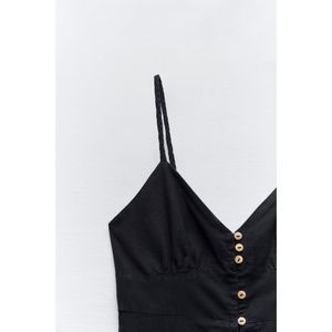 Dress made of linen blend fabric. V-neckline and woven thin straps. Elastic at back. A-line silhouette with front slit. Wooden button front closure.
