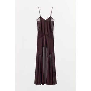 Long combined dress with a V-neck and thin straps. Matching inner lining. Back fastening with fabric-covered buttons and a concealed side zip.