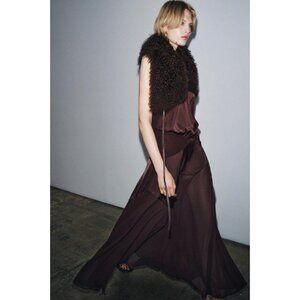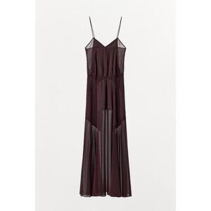 Long combined dress with a V-neck and thin straps. Matching inner lining. Back fastening with fabric-covered buttons and a concealed side zip.