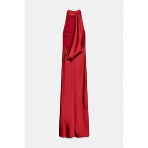 Long dress made from satin fabric. Adjustable halter neck with buttons and exposed shoulders. Fabric appliqué detail on the back and a matching crossover strap. Invisible side zip fastening.