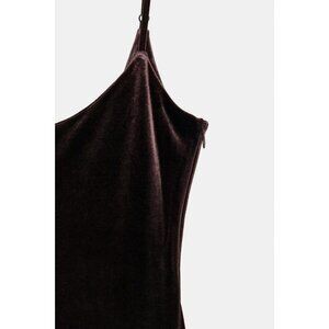 Long dress made of velvet. Round neckline and adjustable spaghetti straps. Flared hem.