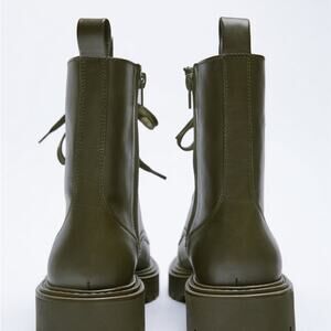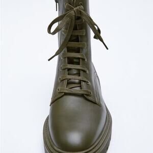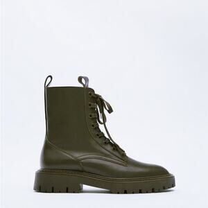 ZARA LOW HEEL LACED LEATHER ANKLE BOOTS KHAKI GREEN