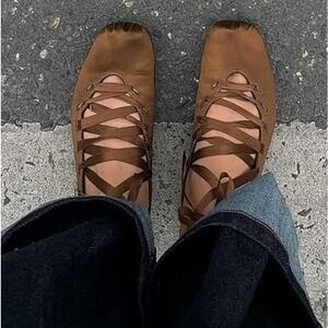 ZARA Lace Up Ballet Flats NWT Ochre Brown Satin Effect Size 7.5