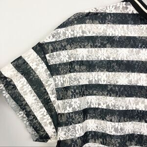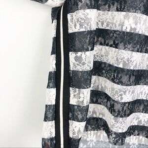Adorable black and white striped top by Zara!! Fully sheer lace body. Short sleeves. Semi cropped. High neck with stripe collar. Stripe detail down the sides. Exposed zipper back. Great condition!! Size Small.
